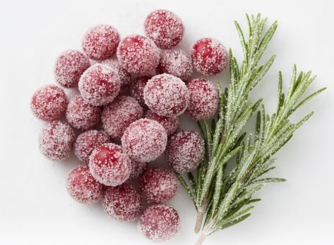 To make: brush rosemary sprigs with simple syrup, sprinkle generously with granulated sugar, and let dry for about an hour. The sugar creates a crystallized coating that looks like frost.
